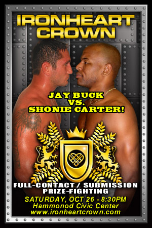 Headlining the card will be a highly anticipated bout between returning IHC welterweight champion, Jay Buck, and the notorious Shonie Carter, also known as "Mr. International." Chicago area fans have been demanding this match-up ever since Jay Buck caught the public's attention with his devastating win over Eddie Rolon in Ultimate Athlete's Genesis show. Both men have proven themselves to be A-Class fighters, but the contrast between their unique styles makes the outcome impossible to predict. Shonie Carter has been involved in the martial arts for most of his life. With 16 years of wrestling experience, he was a collegiate All-American who made it to the U.S. Olympic Trials in Greco-Roman Wrestling. He also has eight years of judo experience which earned him an East Coast Championship at the black-belt level. In 1997 he began training with Master Bob Schirmer of the All-American Academy, adding kick-boxing and jiu-jitsu to his arsenal, while simultaneously honing his wrestling skills. Recently he switched his base of operations to the Chicago Fitness Center, where he has been studying Shidokan Karate under the guidance of Shihan Eddie Yoshimura. All of this experience has earned him the right to compete in the biggest shows world wide, including the UFC and the King of the Cage, the Pancrase and SHOOTO organizations of Japan, and the Warrior's Quest and Superbrawl in Honolulu, Hawaii. He was the first-ever Extreme Challenge lightweight champion, and he was the 2001 U.S. Shidokan middleweight Champion. Carter's vast experience is beyond the scope of this article, but it should suffice to say that in seven years of mixed martial arts experience, fighting at the highest level of competition that the world has to offer, Shonie has maintained an impressive record of 59 wins, 6 losses, and 6 draws. When asked about his thoughts on opponent Jay Buck, Shonie had some interesting comments. "I know Buck's pretty good. I respect the fact that he's the Ironheart Crown Champion right now. He's been doing really well at the local level, and I guess he's earned the right to fight me." "I've seen him fight, and he has skills, but he has to realize that he's fighting at a different level now. He's not just taking it up a notch on this one He's taking it up two or three notches." "Everyone loves to call me a pimp. Do you know what PIMP stands for? It stands for 'Punching Is My Pleasure.' I know his guys think they're going to make a name for themselves by beating me, but if he wants to punch and kick, I'm going to punch and kick harder, and if he wants to take it to the mat, he better realize that he won't be able to ground and pound with me." "I'm not saying that this is going to be an easy fight. Hell, I never get easy fights, but no matter how tough Buck may be, the outcome's going to be the same. I'm a father. Right now I'm raising an 18 month old baby, and one thing I've learned from raising my kids is that when a baby learns to walk, he gets a little confidence, and all of a sudden he's walking into a world of shit that he wouldn't have gotten into if he was still crawling. That's kind of what Jay Buck is going through right now." While Carter's comments may sound arrogant, no one can deny that he has earned the right to be cocky. Still, a review of Buck's credentials raises some doubt in the minds of those who have followed his budding career. Jay Buck has been boxing for a total of fourteen years. For two years in a row, he was a finalist in Chicago's Golden Gloves. Add to that ten years of wrestling experience through the collegiate level, with All-State and All-National recognition, and you have a fighter born and raised for the mixed martial arts. Three years ago, Buck brought his background to the martial arts world, training at first with Jeet-Kune Do stylist, Joe Goytia, and later with Keith Hackney of UFC fame. For the past two years, he has been working out on a daily basis with Joey and Danny Gilbert out of Gilbert Grappling in Mokena, Illinois. By adding various martial arts techniques to a solid background of boxing and wrestling, Jay Buck has become a juggernaut in the mixed martial arts arena. While he does not have Carter's experience, Buck has completely annihilated just about every man he's faced. Before becoming the Ironheart Crown welterweight champion, he fought in Japan SHOOTO events, the HooknShoot, Ultimate Athlete, and King of the Cage. He has a total of fourteen fights under his belt, with only two losses early in his career, one of which was a medical disqualification due to a cut above his eye. While he has only two knockouts and three submissions to his name, all of his other victims have succumbed to brutal one-sided "ground-and-pound" beatings that resulted in unanimous decisions. Simply put, he has won all of his matches powerfully and decisively, in contrast to the many controversial split-decisions which seem to characterize Shonie Carter's career. When discussing his upcoming fight against Carter, Jay Buck exuded confidence. "He's taking me way too lightly. I know he thinks he's better than me. I'm just going to go in there and do what I always do. This fight won't be any different than the others. I'll probably keep it standing, because I don't think he can box with me. If we get tied up in a clinch, he's the one who's going to get launched - not me - and then I'll ground and pound him. I know I can control him on the ground. I've fought better wrestlers. I know it's going to be a tough fight for me, but I think I'll probably knock him out in the first round. Oh, and if he wants to compare me to a baby learning to walk, he's going to find out that I already know how to walk and on fight night, I'll be walking all over HIM." Hard words from a hard fighter. No matter what the outcome, one thing is certain. This fight will pit two talented fighters against one another in an exciting match that won't soon be forgotten! In addition to the main event, five other title 
